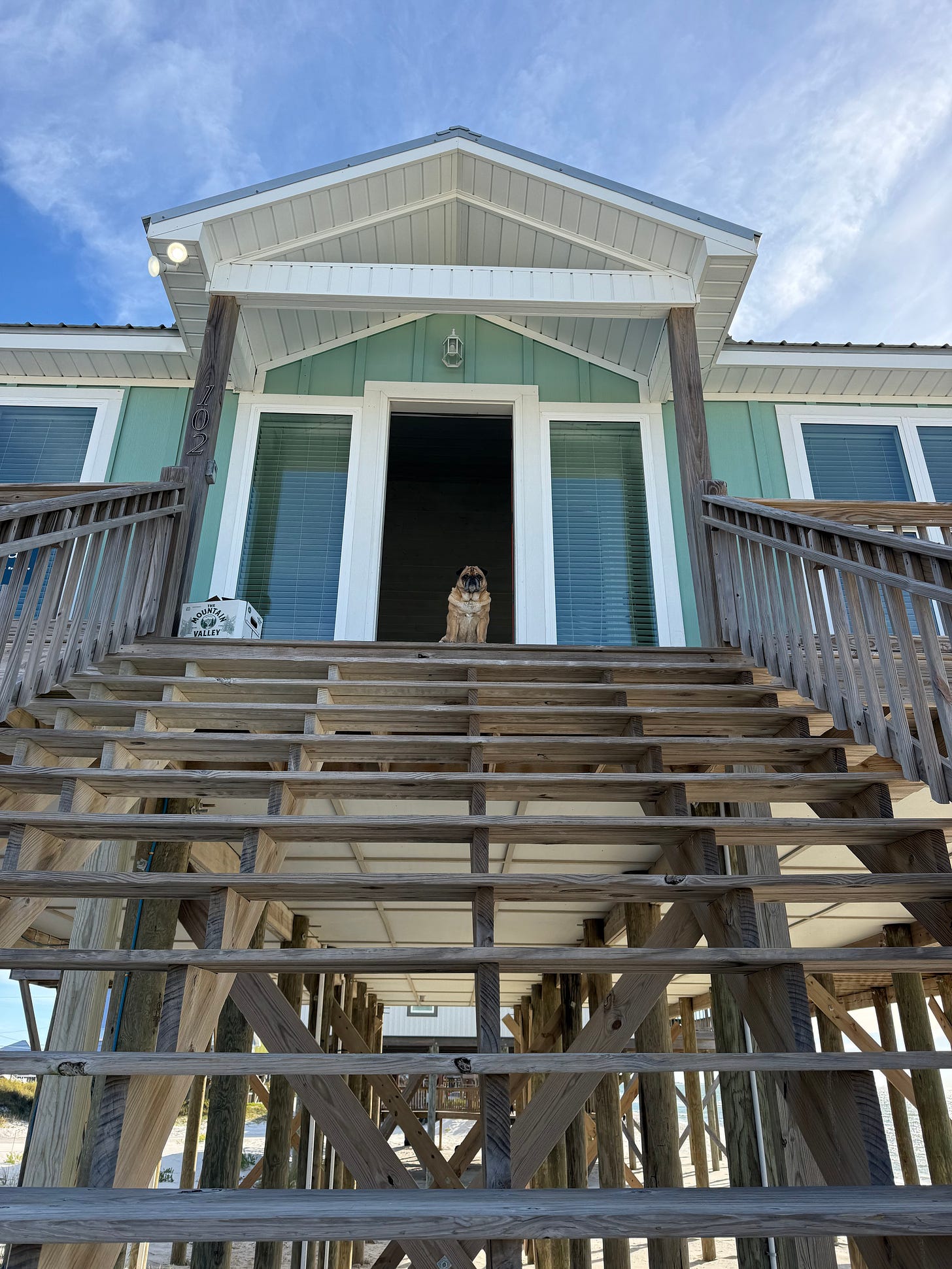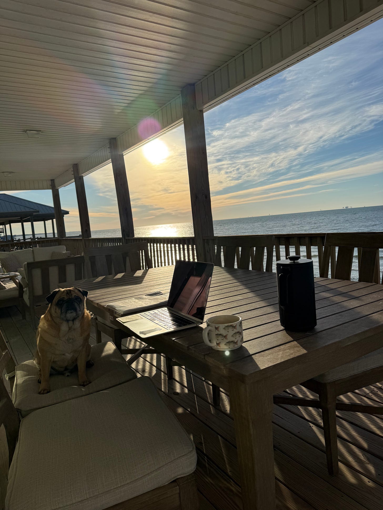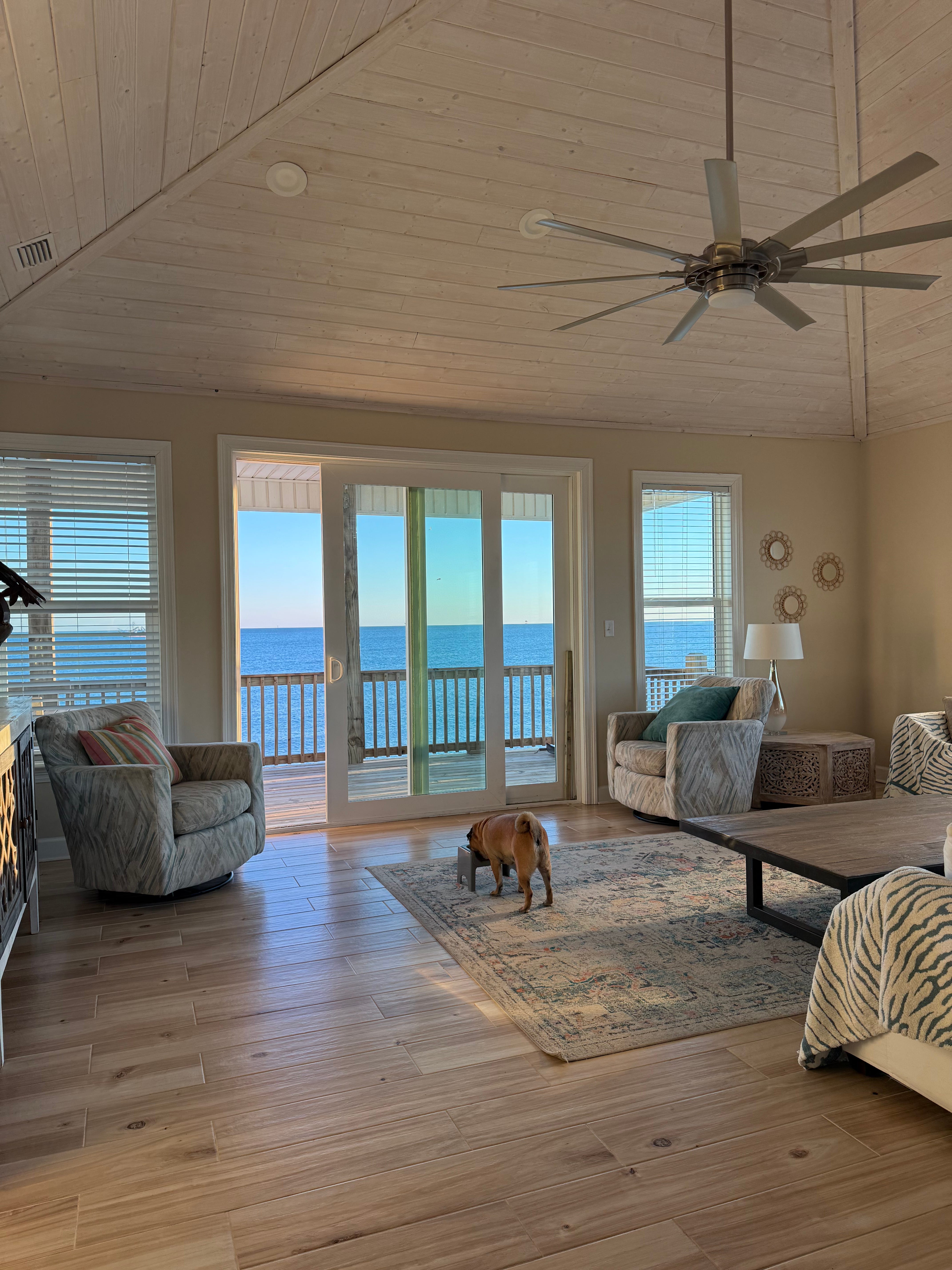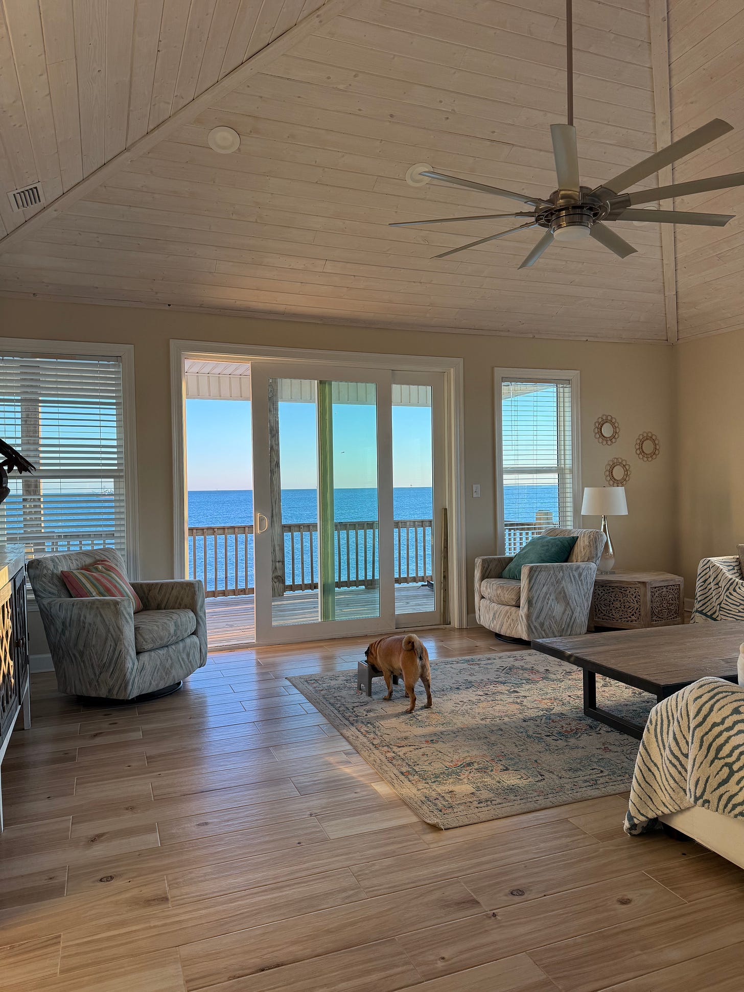 There’s a large wooden wrap around deck that hugs the house, with over sized couches and a massive wooden dinner table built for 6. All with a view of the vast Gulf of America. Mexico. Whatever.