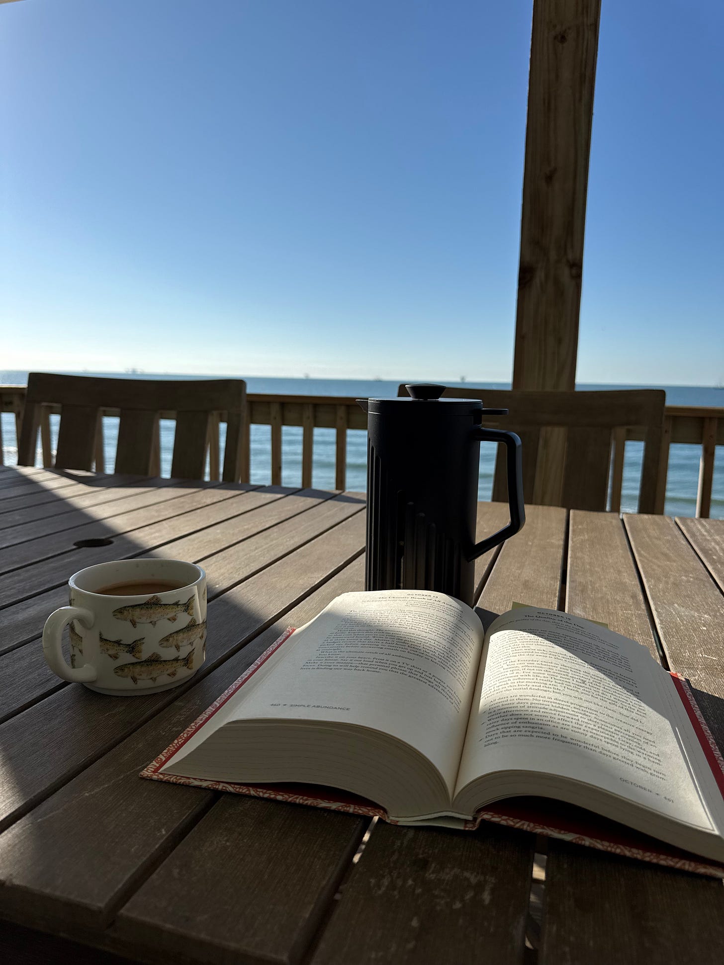 I sit in the middle of this table sipping coffee from a french press every morning, watching weary overnight shrimp boats anchor down for the day to rest.